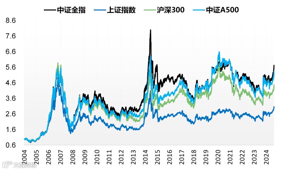 下图列出了中证全指、上证指数、沪深300和中证A500过去逾20年(2005年至今)的业绩表现,很容易发现中证全指是当中表现最好的,期间这四个指数分别上涨472%、207%、347%和431%。