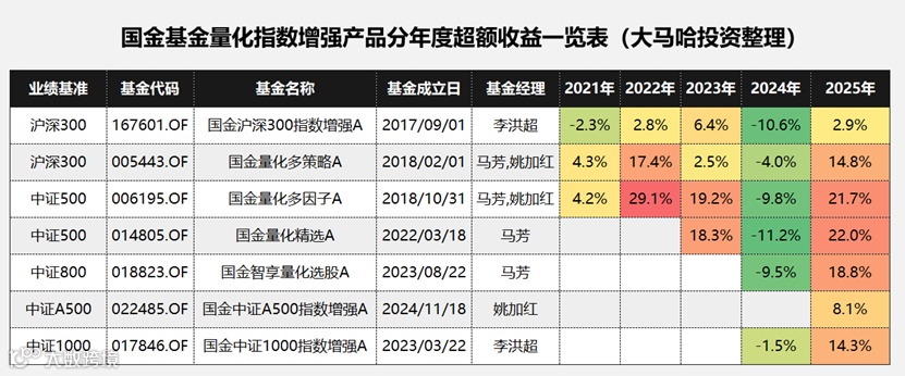 我特别梳理了下,不包括即将于9月1日开始发行的中证全指指数增强外,目前国金基金量化投资团队共管理有7只公募量化产品(3只指数增强和4只主动量化产品),合计管理规模为111.51亿(截至2025年6月30日),这7只产品具体覆盖到沪深300、中证500、中证800、中证A500和中证1000对应的指数增强或者主动量化产品。