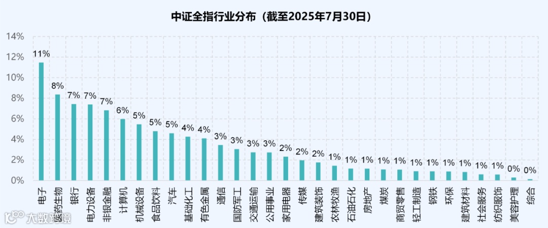 上表列出了中证全指的最新行业分布情况,可以看出中证全指不仅个股分散(前十大个股权重合计为10.21%),而且行业也是分散的,权重最大的行业为电子(11%),其他行业的权重均在8%以以下。