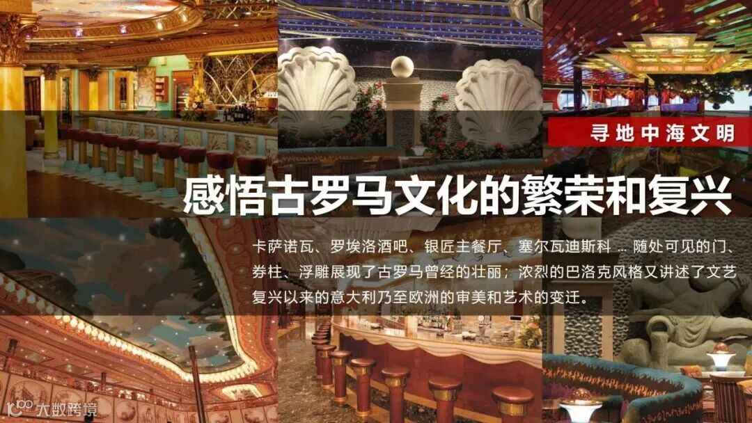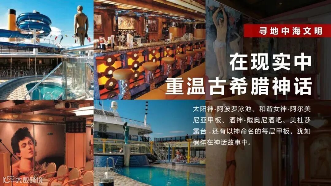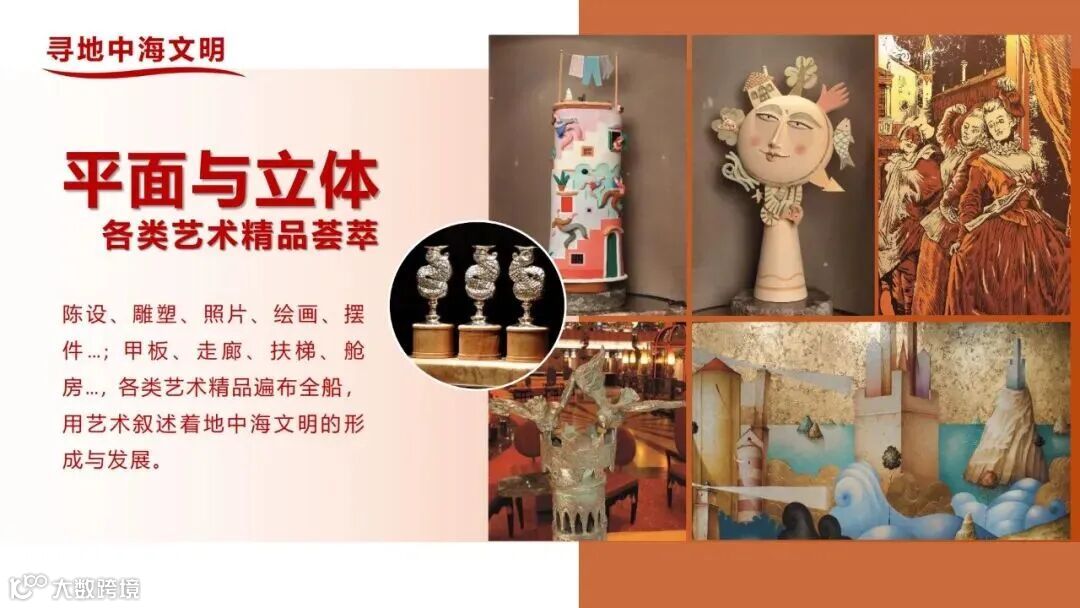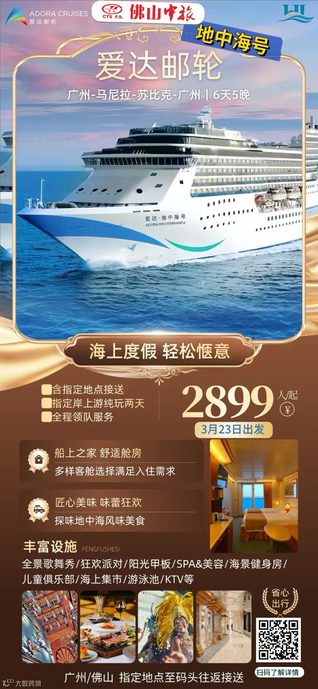 爱达·地中海号(Adora Mediterranea)是由中船嘉年华2021年购入,由旗下爱达邮轮团队负责全面运营的精神级邮轮。邮轮全长293米,总吨位8.6万吨,可容纳2680名乘客,拥有1057间豪华客房和套房,全船设计以地中海文明为灵感源泉,随处可见的油画、雕塑和浮雕装饰以及建筑风格,创新性地融合了中西文化元素,被称为“艺术之船”。