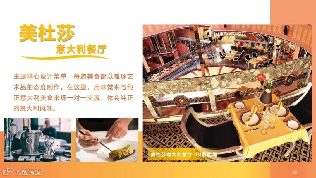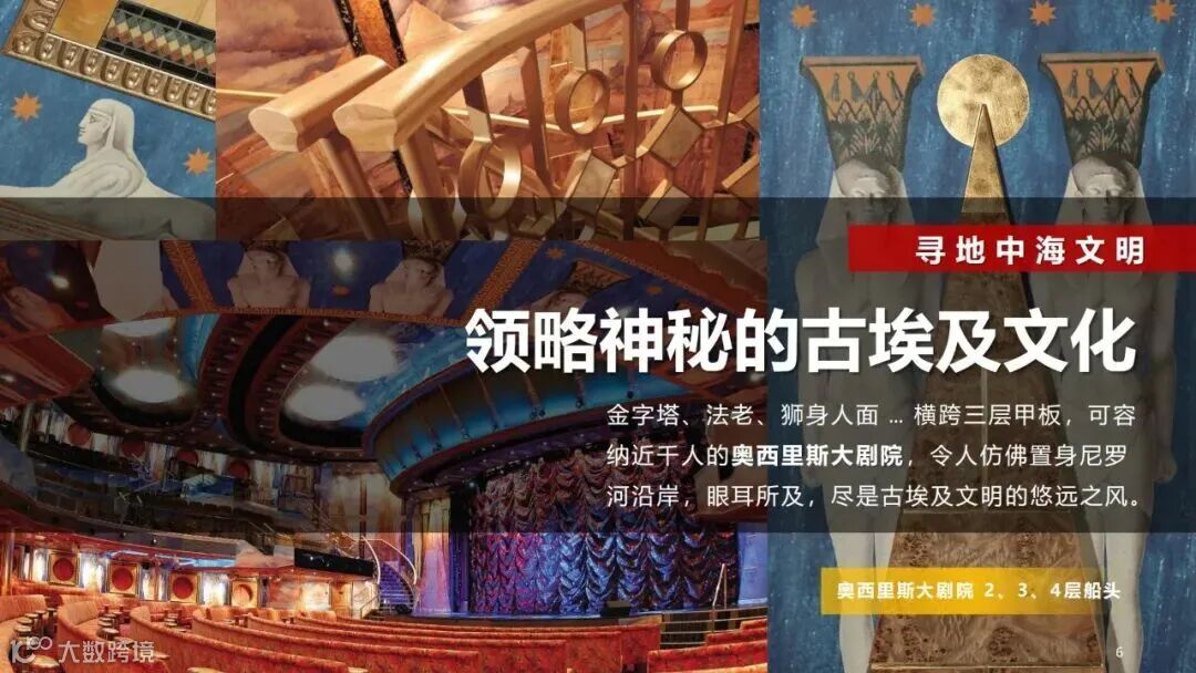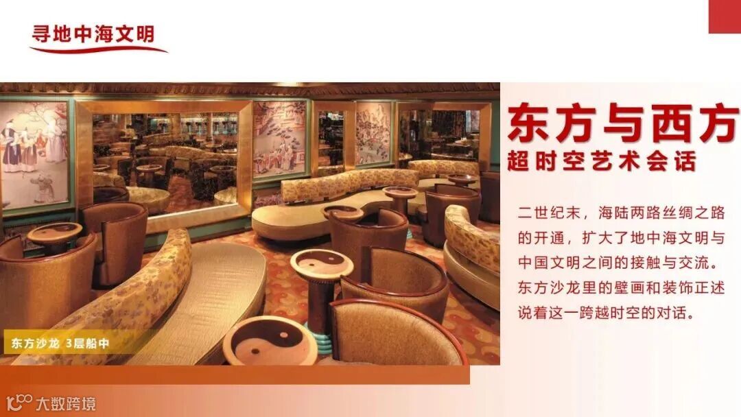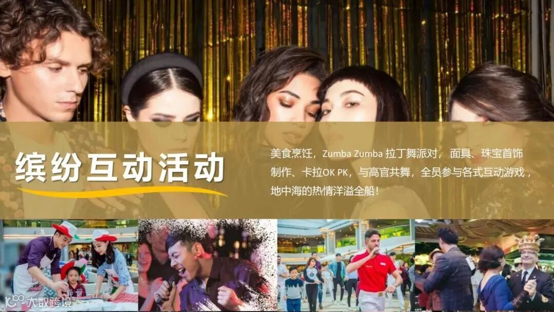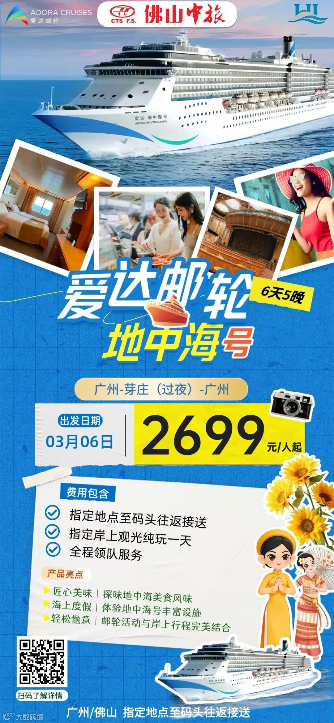 爱达·地中海号(Adora Mediterranea)是由中船嘉年华2021年购入,由旗下爱达邮轮团队负责全面运营的精神级邮轮。邮轮全长293米,总吨位8.6万吨,可容纳2680名乘客,拥有1057间豪华客房和套房,全船设计以地中海文明为灵感源泉,随处可见的油画、雕塑和浮雕装饰以及建筑风格,创新性地融合了中西文化元素,被称为“艺术之船”。