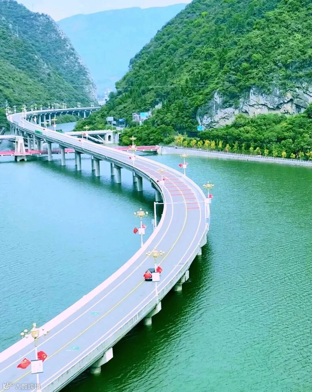 从远山俯视,连接起来的桥墩宛如玉带般飘荡于绿水之中,与四周的青山、溪流构成一道独特、和谐、亮丽的风景