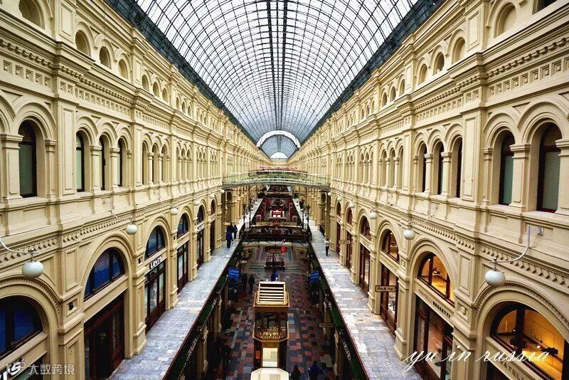 莫斯科最大的百货商场—古姆商场,位于红场列宁墓的对面,古姆百货商场是欧洲最大的百货商店之一。 亚历山大三世于1893年12月2日亲自为古姆开业揭牌。 至今,莫斯科古姆百货商场开业121周。