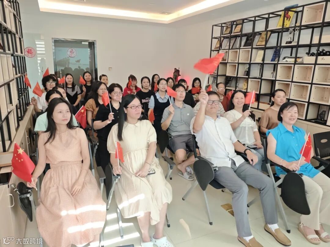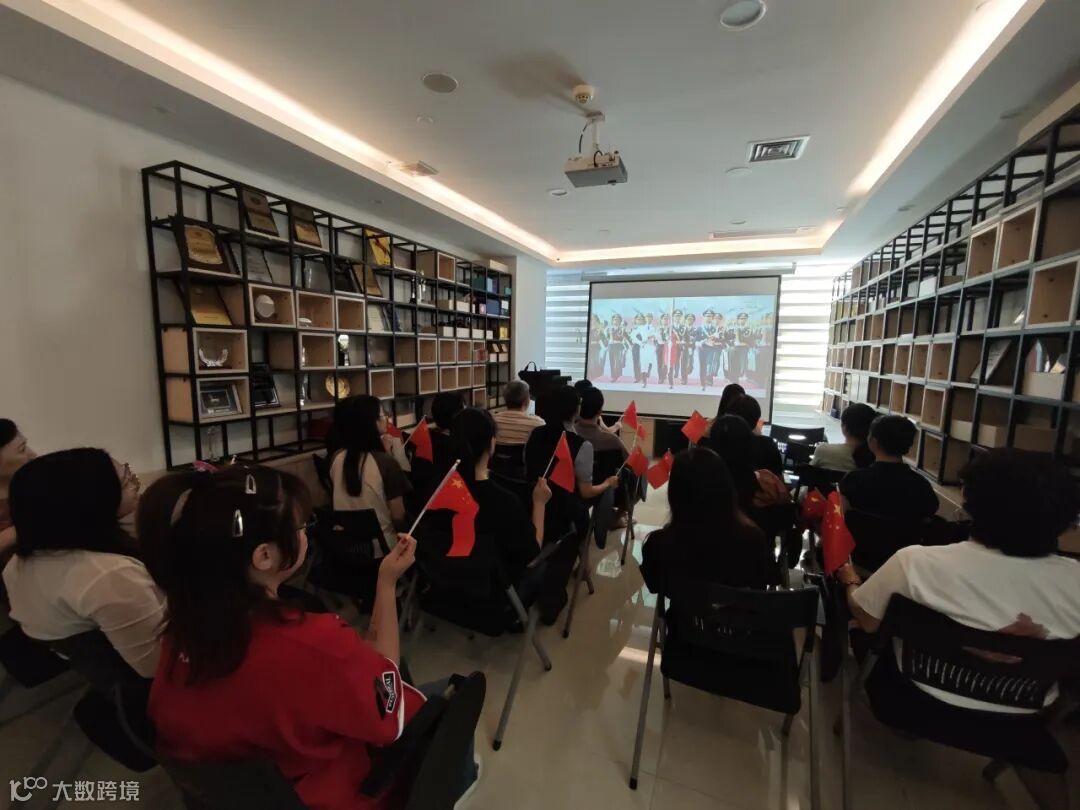 当屏幕里国歌激昂的前奏响起,没有任何提醒,在场的每个人几乎同时起身站立,轻轻将手中的五星红旗举在胸前,目光不约而同地望向画面里飘扬的国旗,跟着旋律齐声高唱。