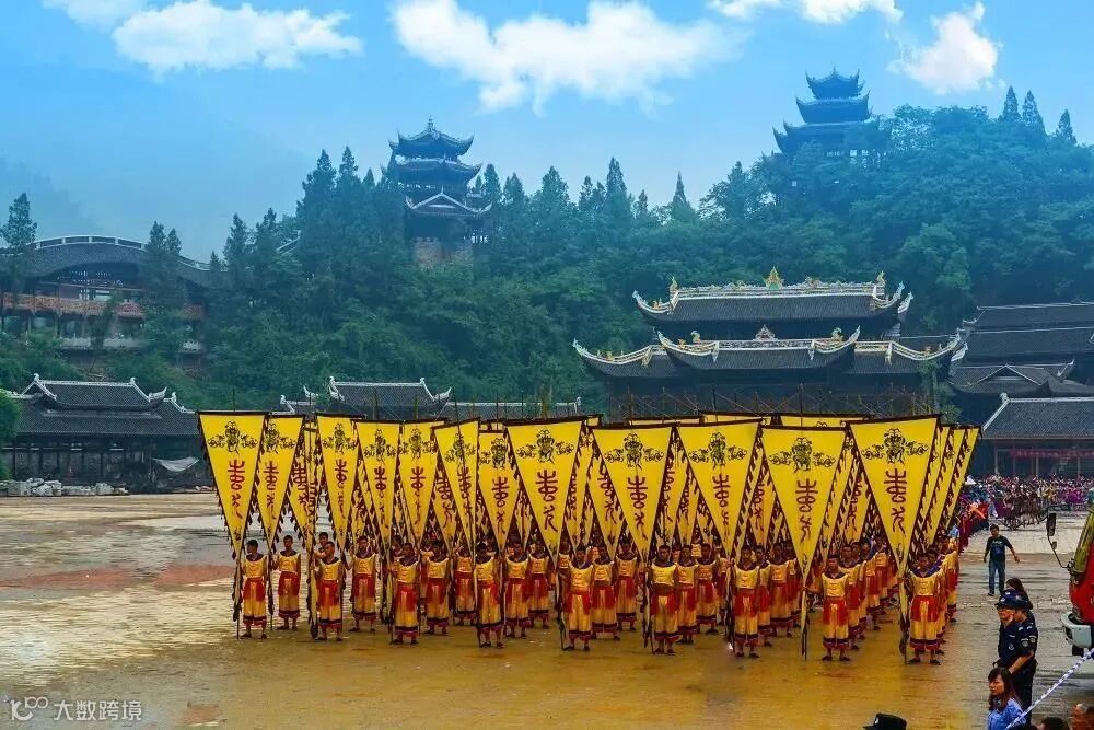 九黎城拥有中国最大的苗族建筑群落,涵盖九道门、九黎宫、九黎部落、苗王府、三苗长廊、蚩尤大殿、九黎神柱等,其中九黎神柱是目前世界上高度最高,直径最大的苗族图腾柱,九黎宫是世界最高最大的吊脚楼建筑体。