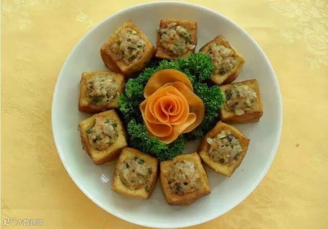 器美。客家人办宴席的菜式有十几道,各式器皿来自天然,使烹制出来的菜肴不变味,如蒸米饭是用木桶为身、篾筚为底、竹盖作顶的饭甑;蒸肉丸用的料箪也是竹篾编制的;赣南的一道称为“荷包胙”的米粉肉,更是以荷叶包裹,置于精美的瓷盘上,宛如出水芙蓉,翩然起舞。兴国的“四星望月”,更是栩栩如生。