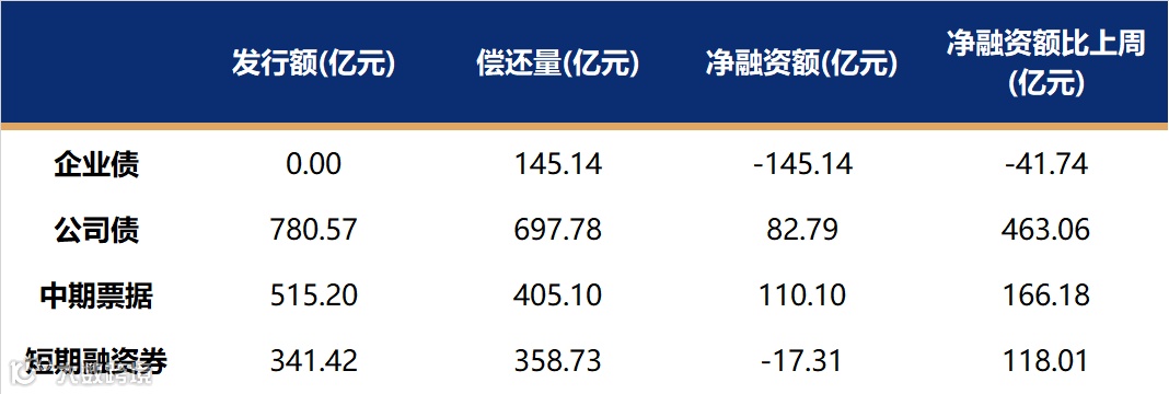 非金融企业短融、中票、企业债、公司债发行量、偿还量、净融资额(与前一周比较)。