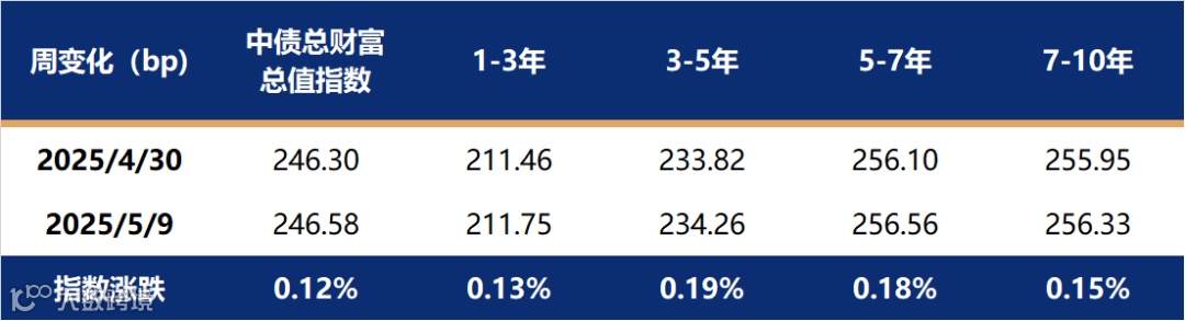 上周多数期限利率债收益率下行,其中短端大幅下行,超长端、长端小幅上行,曲线由平转陡。影响上周利率债曲线陡峭的主要原因是央行于5月7日宣布降准50bp以及OMO利率调降10bp,降准幅度超市场预期降息幅度不及预期,导致债市短端下行长端小幅调整,随着周四周五隔夜资金利率下破1.60%关键点位后,资金成本对于债市的约束减弱,债市大幅走强。中债总财富指数上涨0.12%,其中3-5年、5-7年指数涨幅相对更大。