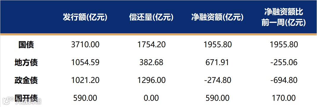 国债、国开、政金债、地方债发行量、偿还量、净融资额(与前一周比较)。