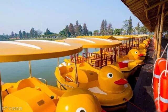 可爱的小黄鸭船悠哉地漫游天鹅湖,