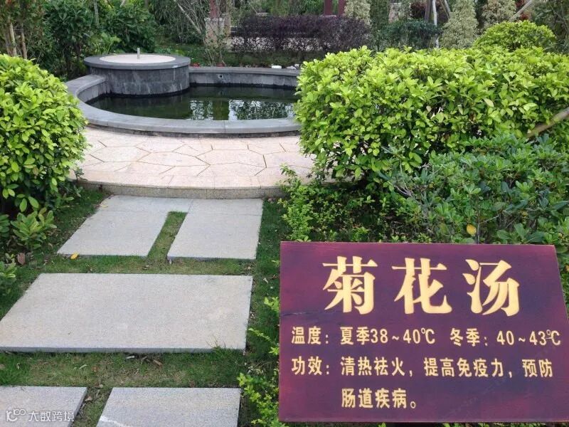 泉水取自地下100米深处,日出水量4000多立方,出水口温度58度,PH值6.5-8.5之间,富含多种对人体有益的微量元素,对人体具有多种理疗用途,对于抗血压、促进新陈代谢、美容、亚健康等有良好作用。