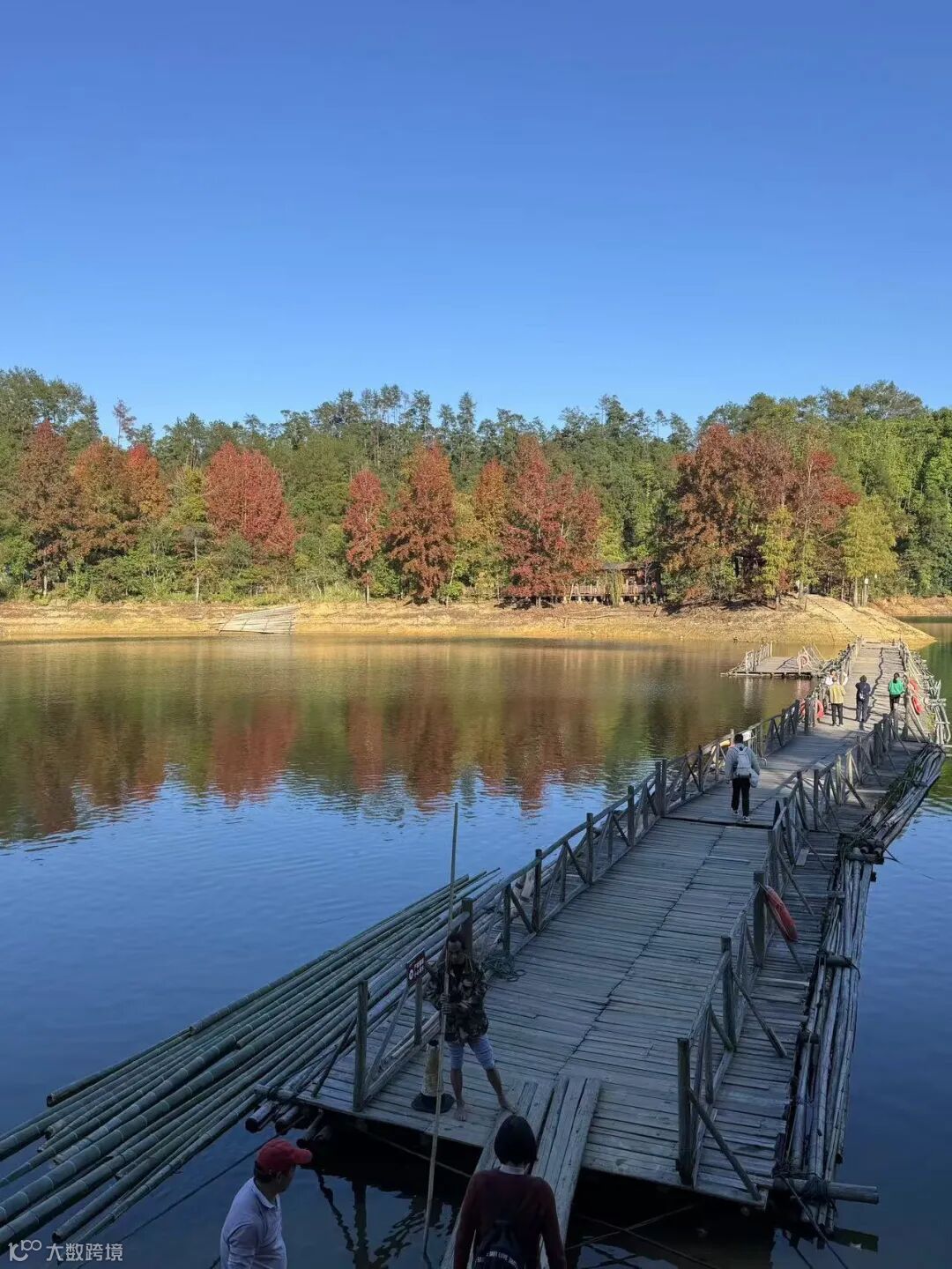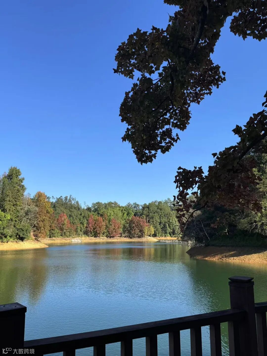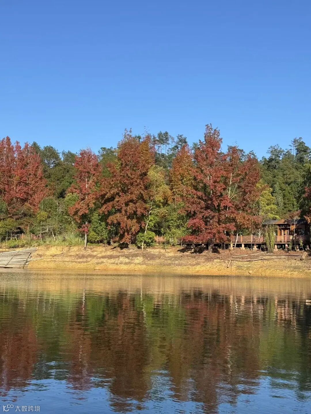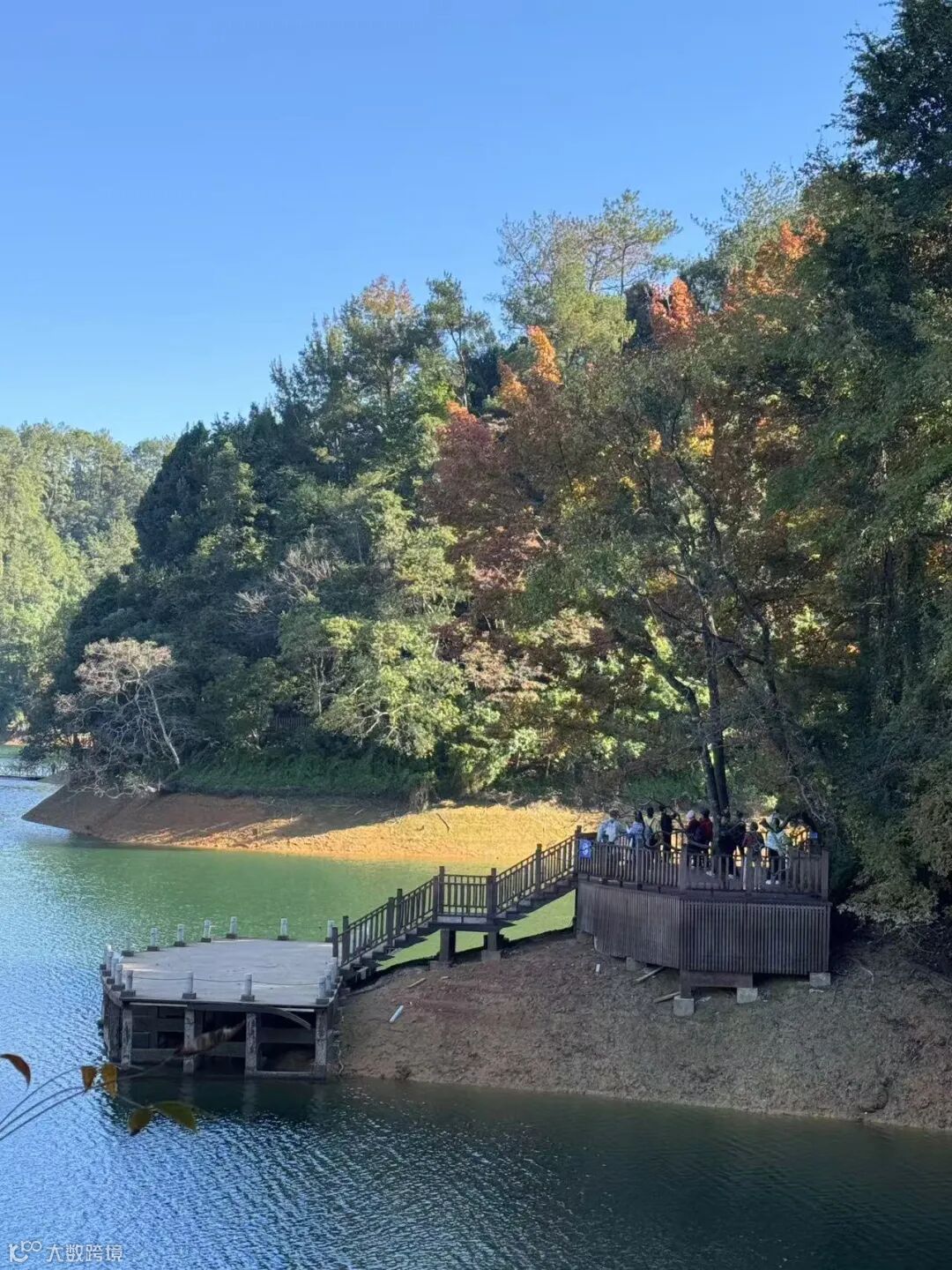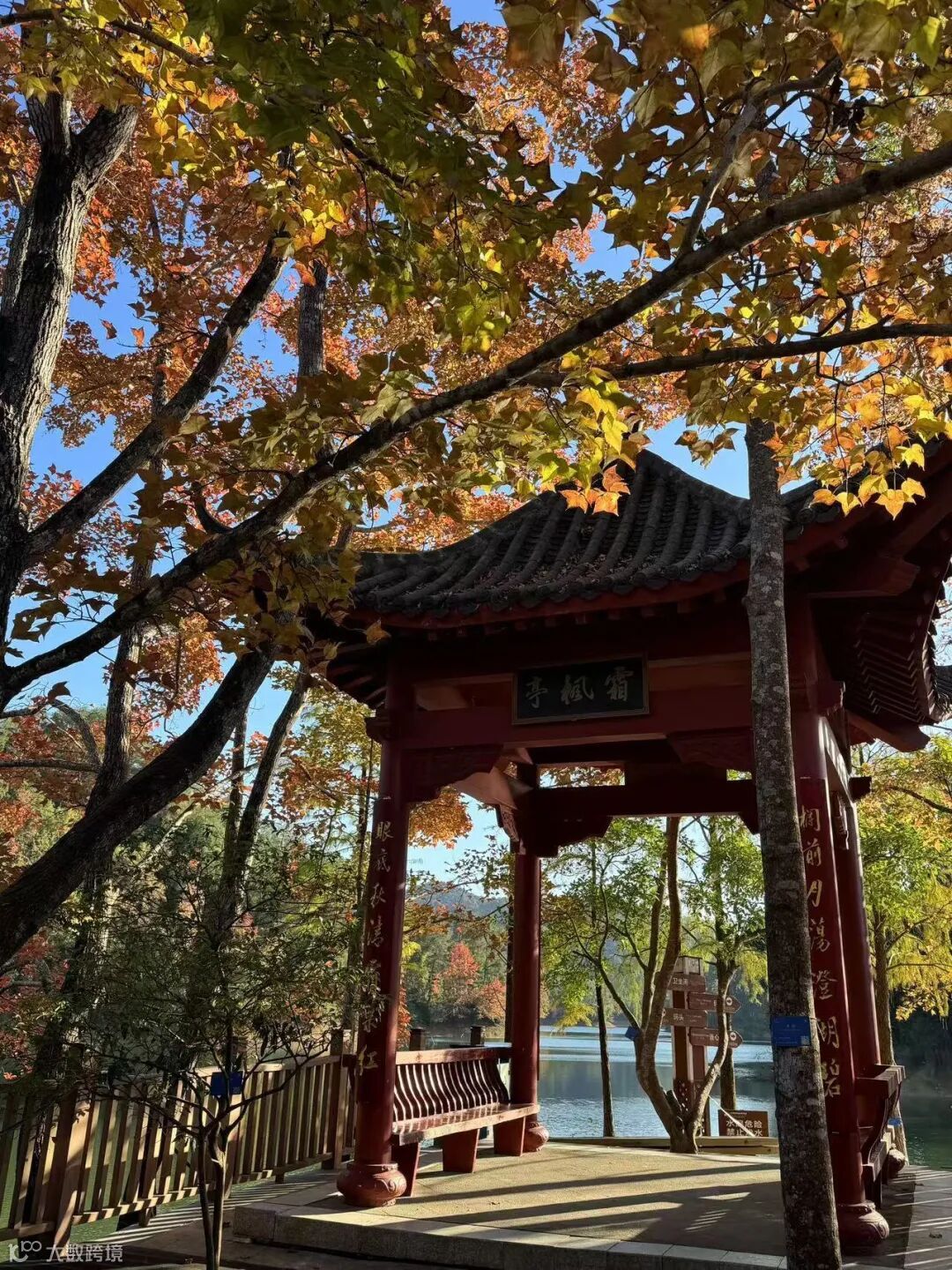 湖岸边的枫香树开始变幻出斑斓的秋色,