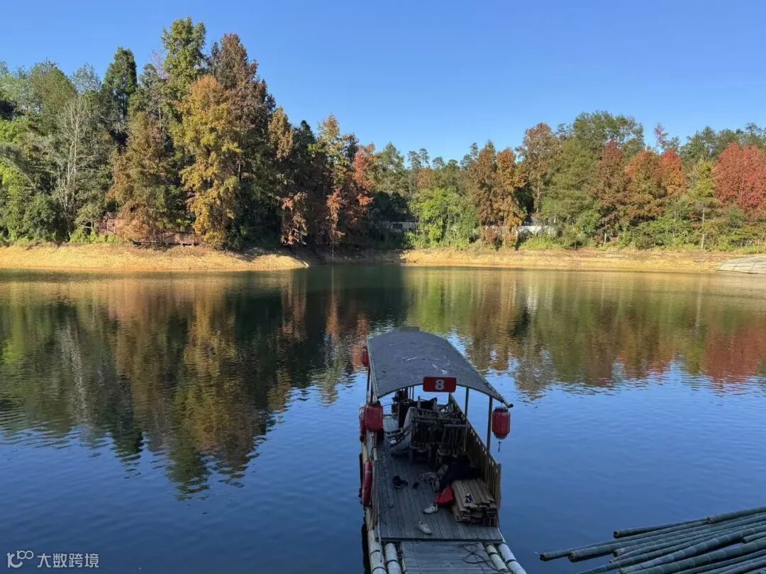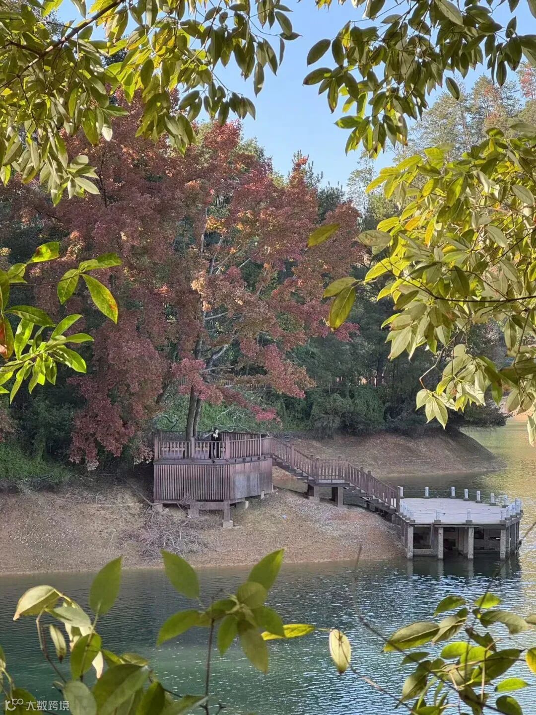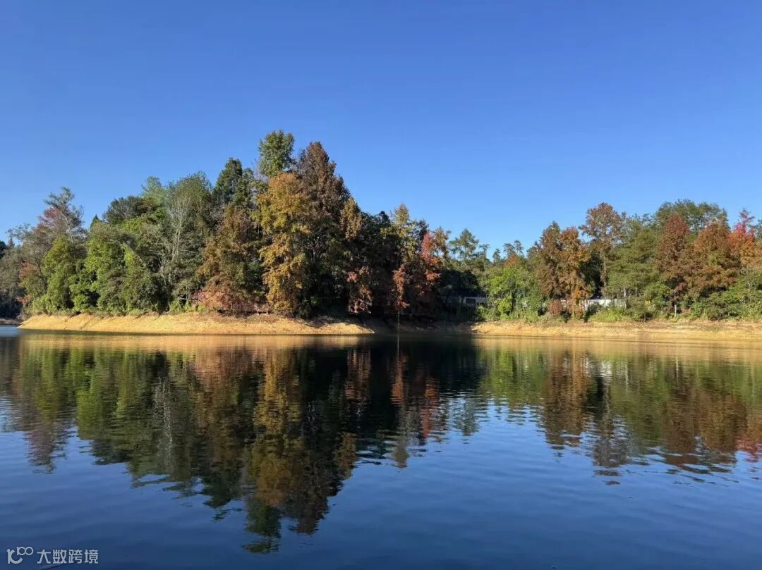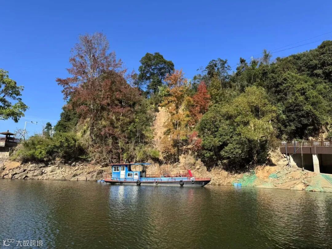 阳明湖的碧波荡漾与红枫相互映衬,