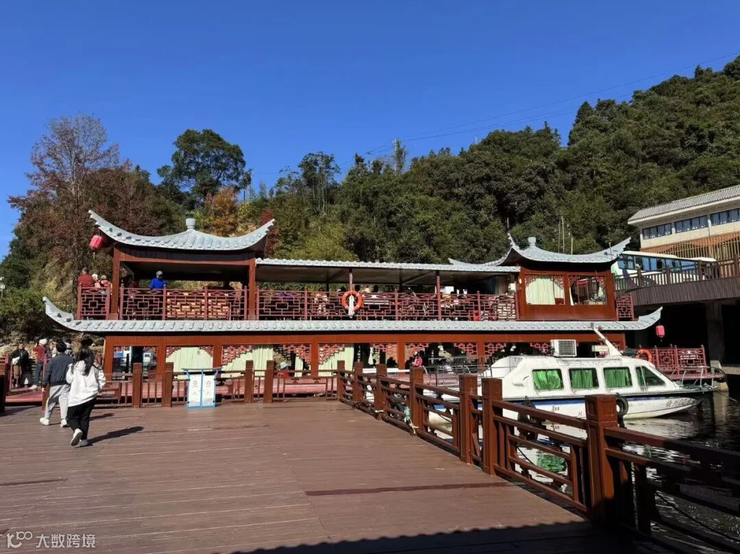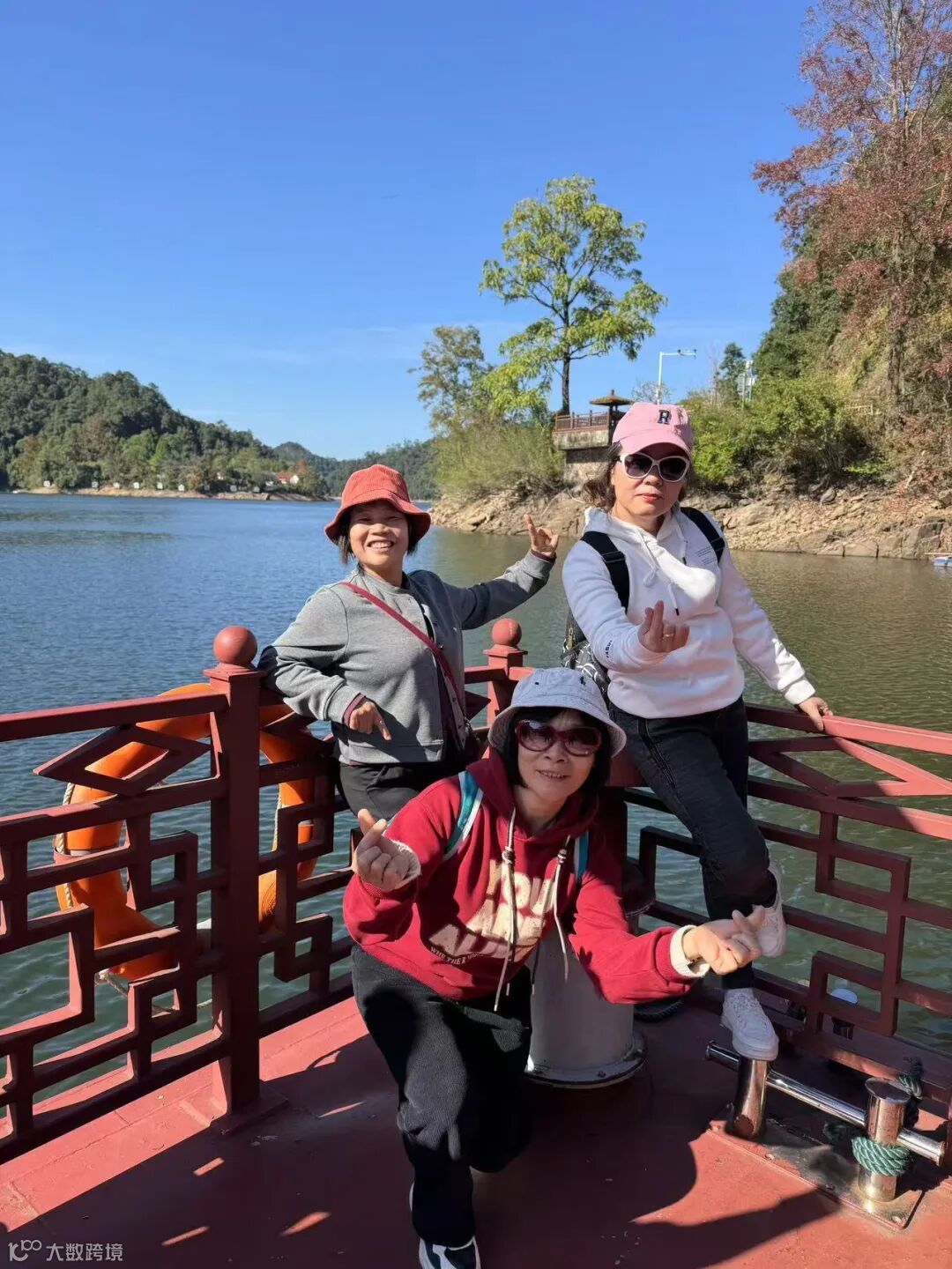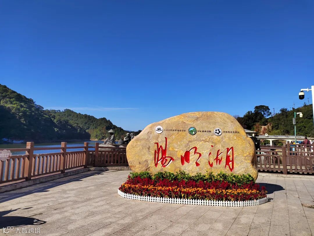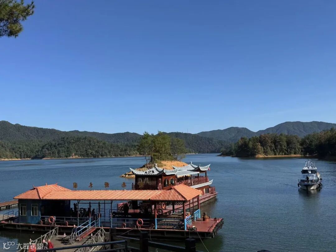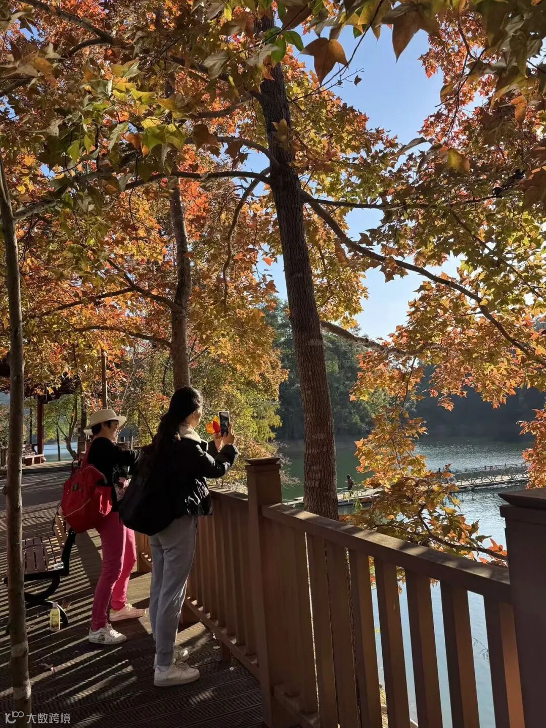 阳明湖的碧波荡漾与红枫相互映衬,