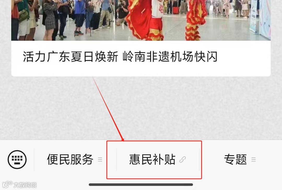 关注“广东文旅”微信公众号,点击菜单栏“惠民补贴”-“广东文旅消费券”进入活动页面。