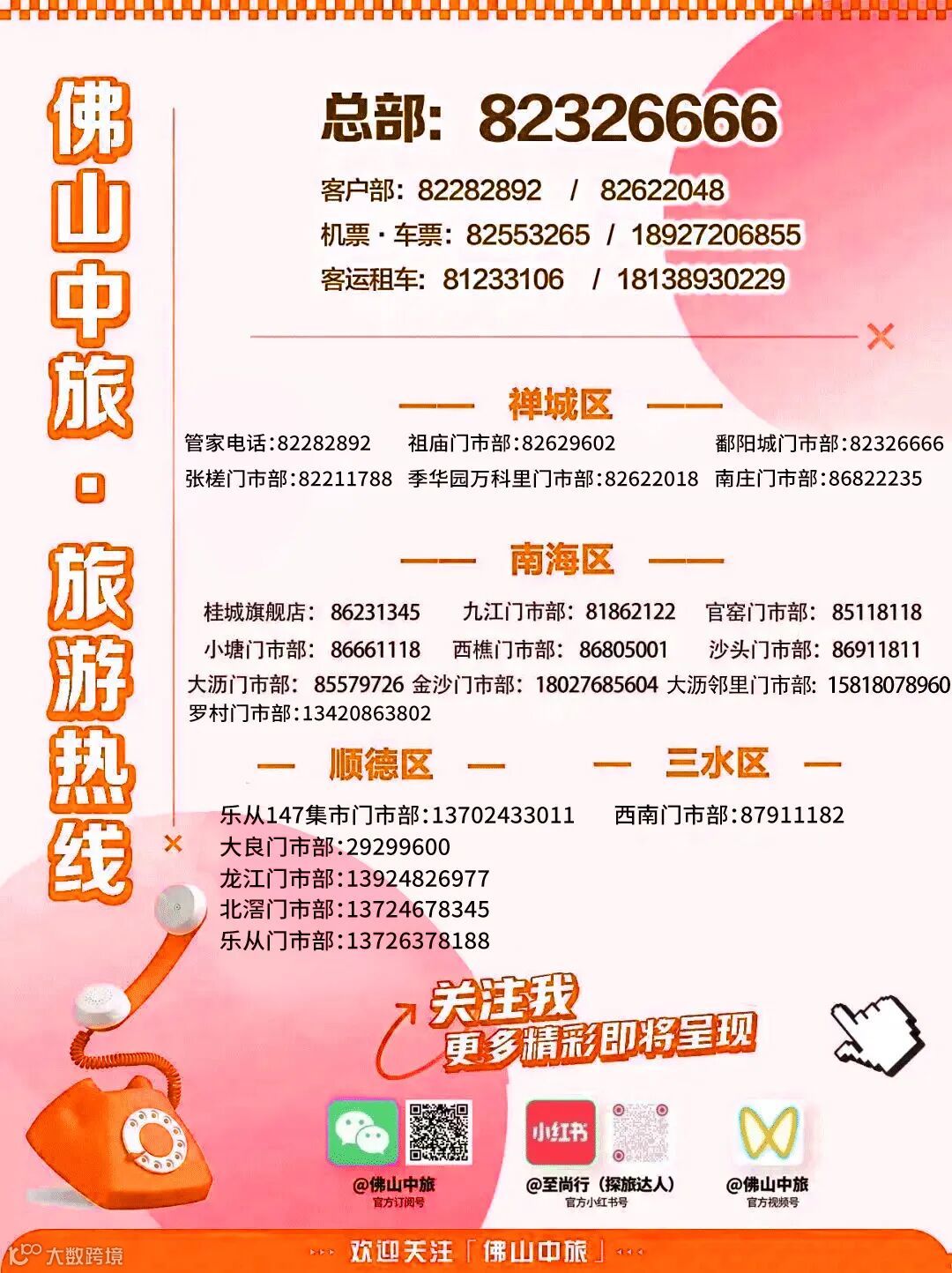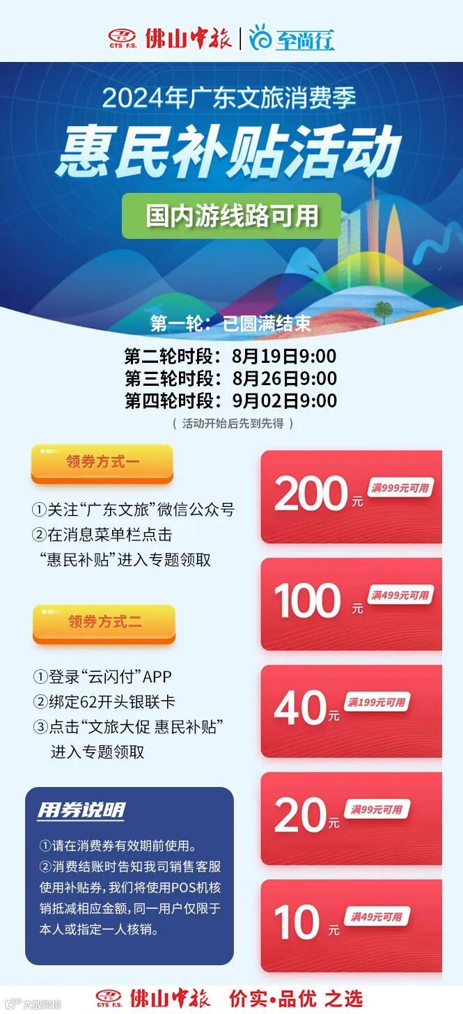 公众领取补贴券后,可在佛山中旅至尚行旅行社购买国内游线路、省内酒店套餐等,享受相关满减优惠,指定路线加码优惠100元!