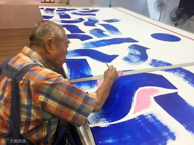 中国抽象画家萧勤在其工作室创作《光之跃动2016》——美狮美高梅「主席典藏」的重点作品。