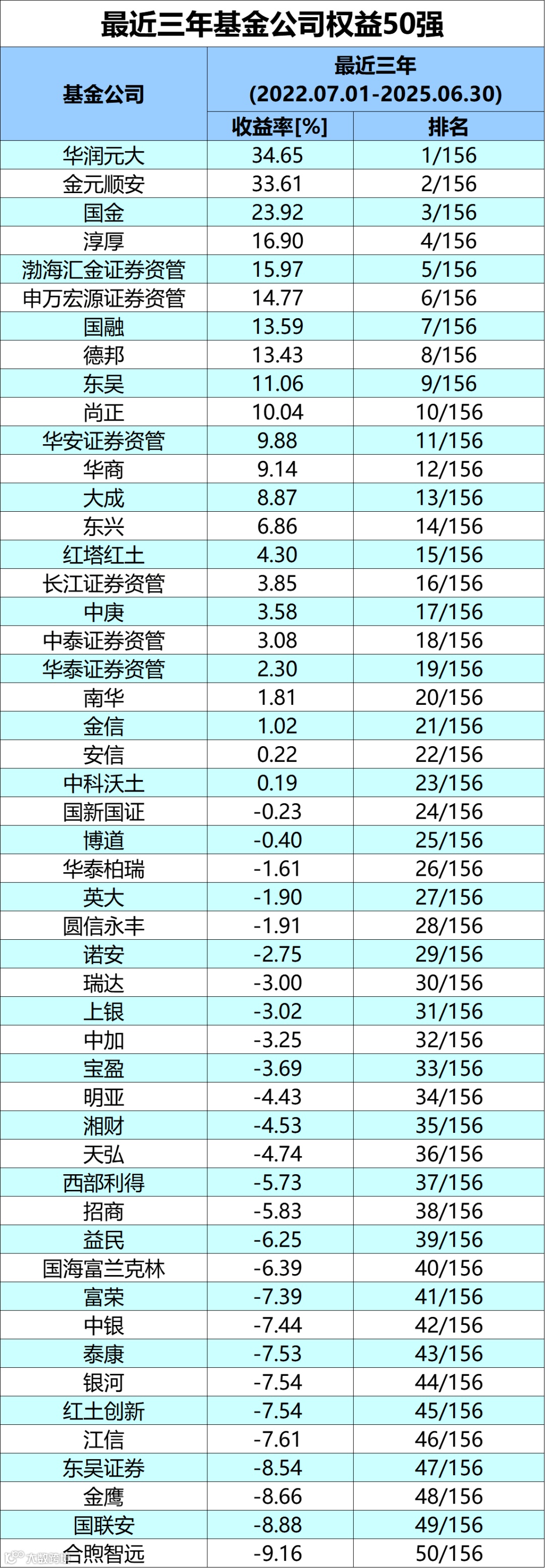 国泰海通证券数据显示,从三年期(2022年7月1日到2025年6月30日)绝对收益排名看,冠军为华润元大,旗下权益类基金平均收益率为34.65%,在156家公司中排名第一。位居第二和第三的分别是金元顺安、国金,旗下权益类基金平均收益分别为33.61%、23.92%;淳厚、渤海汇金证券资管、申万宏源证券资管、国融、德邦、东吴、尚正的收益率也超过10%。