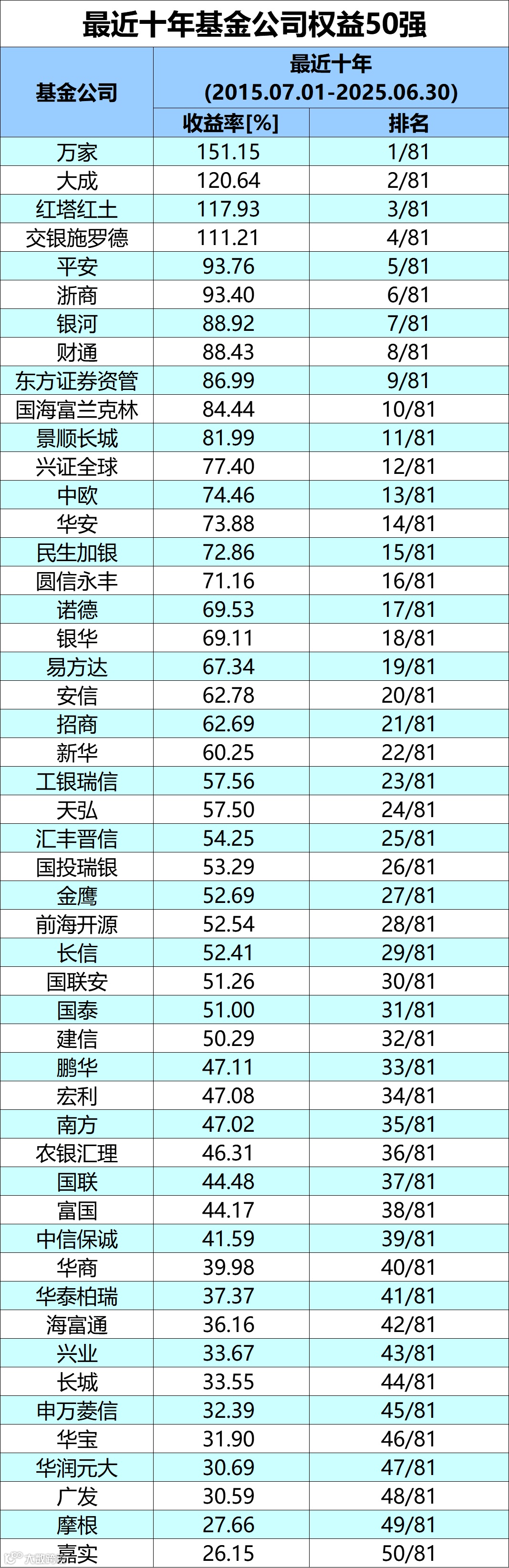 一批基金公司因抓住市场机会取得了不错的业绩。国泰海通证券数据显示,2015年7月1日至2025年6月30日期间,万家基金位居近十年权益类基金绝对收益榜榜首,近十年权益基金平均收益率为151.15%,在81家基金公司中排名第一。