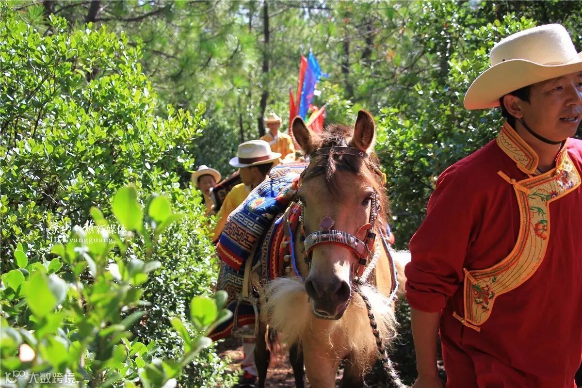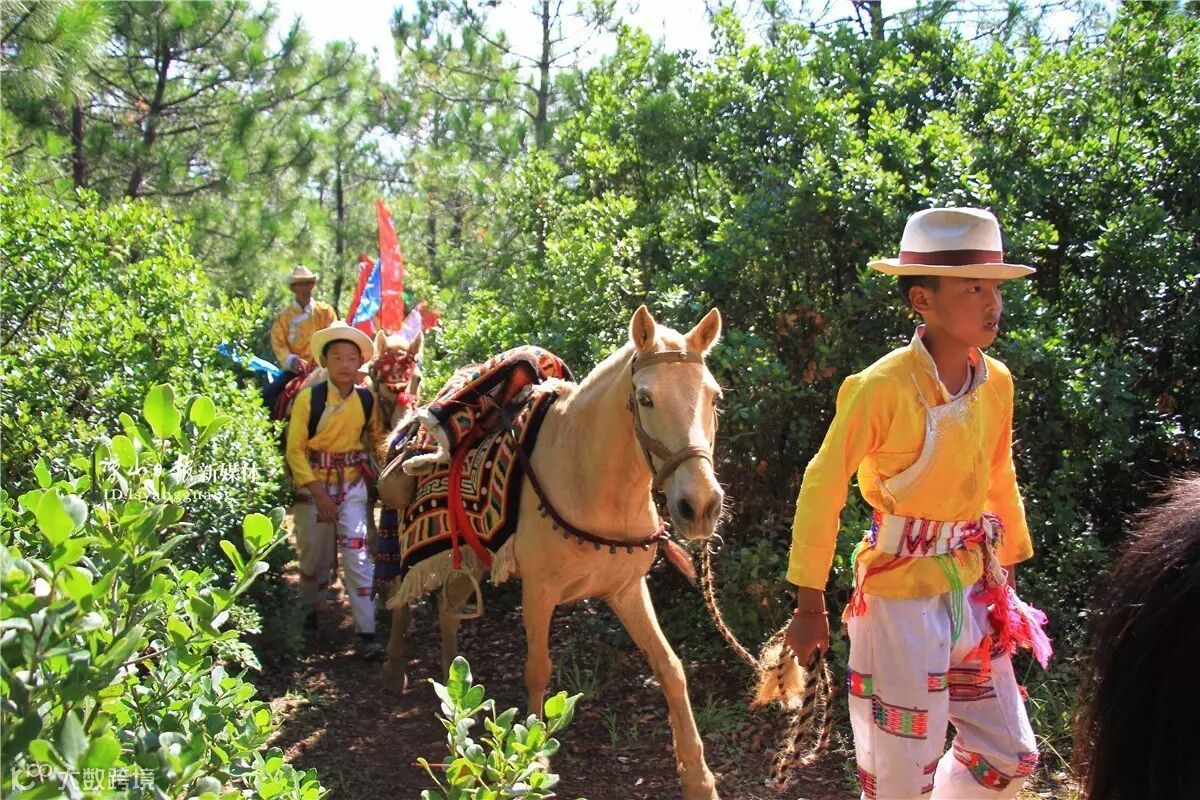一匹匹穿梭在林间的转山马匹,