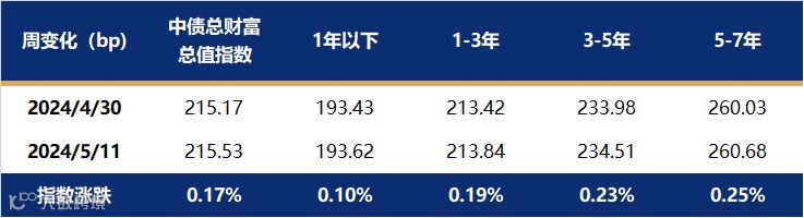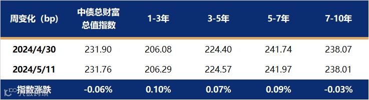 五月初含调休日在内的六个交易日债市收益率先下后上,周六尾盘收益率再度拐头向下,10年国债仍然围绕2.30%关键点位展开博弈,曲线结构中5年表现较为坚挺,3年内短端和长端小幅上行。调整原因主要是多地楼市限购松绑、央行再提示长债收益率风险、特别国债供给节奏不确定性等利空因素扰动。而4月社融数据公布显示实体融资需求仍有待改善,债市再度走强。截止至5月11日,1年期国债收益率报在1.7092%,较4月30日上行1.64bp;10年国债收益率报在2.3361%,较4月30日上行1.75bp。中债总财富指数微跌0.06%,其中7-10年指数微跌,其余期限指数微涨。