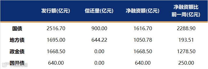 国债、国开、政金债、地方债发行量、偿还量、净融资额(与前一周比较)。