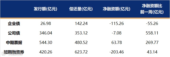 非金融企业短融、中票、企业债、公司债发行量、偿还量、净融资额(与前一周比较)