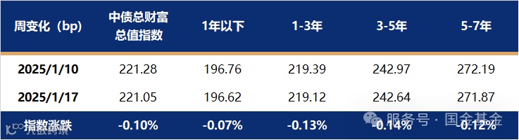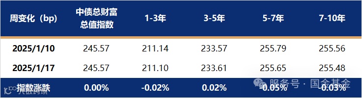 上周利率债收益率持续上行,超短端和长端、超长端上行较多,曲线中段变化不大。影响全周债市收益上行的主要原因是10号央行宣布暂停公开市场国债买入操作后,上周资金价格大幅攀升,融资成本与各期限利率债收益率均倒挂,负carry环境下利率债短端收益率大幅上行,短端偏弱的情绪传导至长端上行。截至1月17日,1年期国债收益率报在1.2617%,较1月10日上行6.56bp;10年国债收益率报在1.6593%,较1月10日上行2.55bp。中债总财富指数变化不大,各期限指数收益率基本与前一周持平。