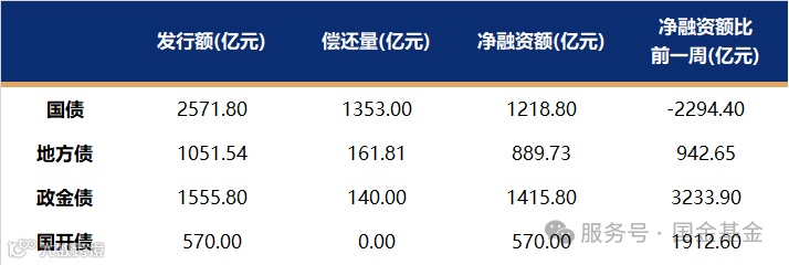 国债、国开、政金债、地方债发行量、偿还量、净融资额(与前一周比较)。