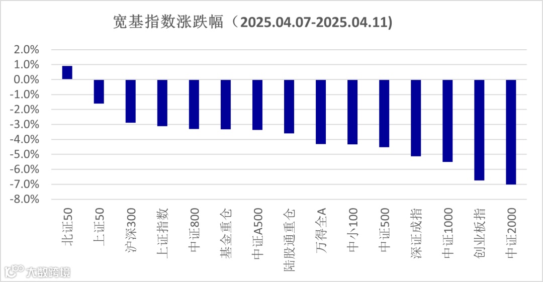 美国关税政策的反复变化,同时保持对华的不断施压,导致市场风险偏好大幅波动,指数同样出现较大波动。上周A股权益指数在周一大幅回落,但随后监管层和上市公司对权益市场的呵护力度提升,投资者信心得到提振,A股市场随后震荡回升。截止上周五收盘,上证指数一周下跌3.1%、万得全A指数下跌4.3%。宽基指数中,北证50指数表现较好且获得正收益,周涨幅达到0.9%,究其原因是其权重个股主要为医药和自主可控领域的科技股,在市场风险偏好触底回升过程中,获得较好的资金青睐度。市场的成交量在前半周有恐慌性放大,上周五成交规模收缩,全周日均成交额为1.61万亿,较前一周1.14万亿明显提升。
