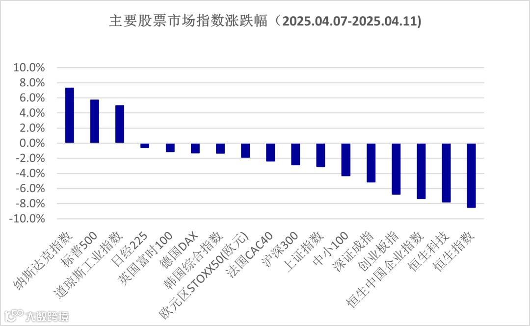 上周外围权益市场也经历了大幅波动,美股经过剧烈波动后呈现阶段性的超跌反弹,标普500指数周涨幅为5.7%,但指数点位仍低于美国新一轮关税政策之前。相比之下,欧洲、日本、韩国市场的权益指数仍然呈现下跌走势。随着关税壁垒的提升,全球投资者对全球经济迈入衰退的预期进一步加强,这导致大宗商品的价格继续下降。权益市场的盈利也进入预期下调过程,后续仍需观察关税对全球贸易,以及企业盈利的影响,短期风险偏好较难提升。