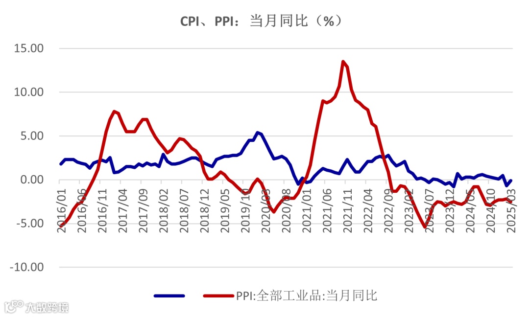 上周统计局公布了2025年3月的CPI、PPI数据。从数据分析,CPI当月同比增速为-0.1%,较2月-0.7%回升0.6个百分点,但CPI环比、PPI同比、PPI环比均较2月份回落。从分项数据分析,CPI同比降幅收窄,主要来自于食品项的增速回升,核心CPI和非食品分项均回升至正增长。相比之下,PPI各分项表现较弱,生活资料和生产资料的同比增速均回落0.3个百分点,至-2.8%、-1.5%,带动PPI当月同比增速为-2.5%。结合CPI和PPI数据,一季度GDP平减指数仍然负增长。展望未来一个季度的通胀数据,仍不容乐观,随着美国关税税率的提升,后续出口需求或有所下降,供需缺口或继续扩大,或导致通胀压力进一步抬升。