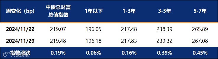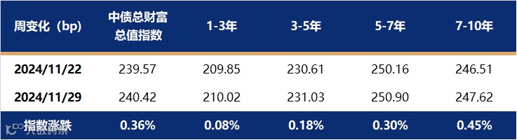 上周利率债多数期限收益率大幅下行,其中长端、超长端下行幅度更大,曲线由陡转平,国开债表现强于国债。影响全周债市走势的主要原因是政府债发行高峰期即将过去,且临近12月,债市进入配置行情。上周五《关于优化非银同业存款利率自律管理的倡议》落地,其中提到非银同业活期存款应参考公开市场7天逆回购利率,带动中短端利率债走强。截至11月29日,1年期国债收益率报在1.3698%,较11月22日上行1.94bp;10年国债收益率报在2.0206%,较11月22日下行6.26bp。中债总财富指数大涨0.36%,其中7-10年指数涨幅更大。
