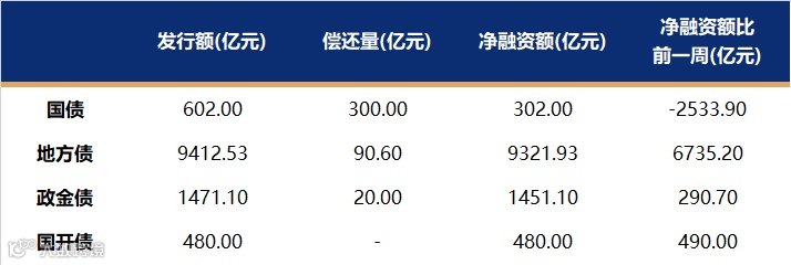 国债、国开、政金债、地方债发行量、偿还量、净融资额(与前一周比较)。