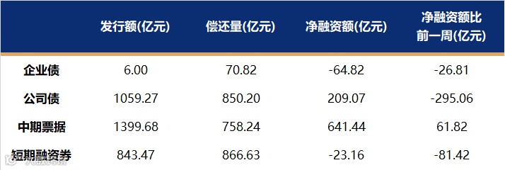 非金融企业短融、中票、企业债、公司债发行量、偿还量、净融资额(与前一周比较)