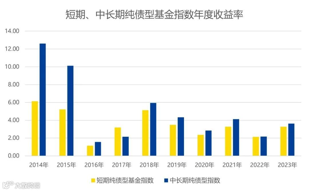 (数据来源:Wind。标的指数:短期纯债型基金指数(885062.WI),中长期纯债型基金指数(885008.WI);统计区间:2014年-2023年。指数历史表现仅供参考,不代表未来表现。)