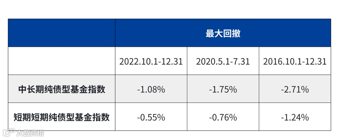 细分来看,在近10年,选出3次较大幅度回调时段内,中长期纯债型基金指数的期间最大回撤大于短期纯债型基金指数。