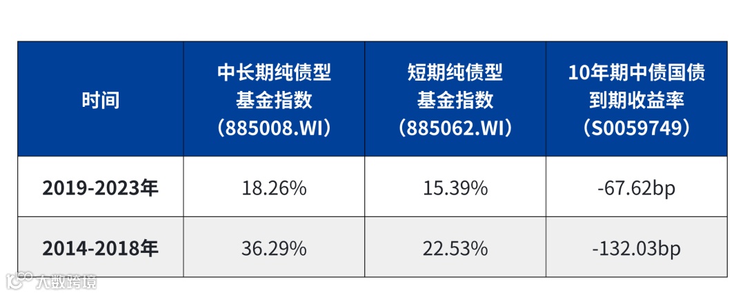 总体来看,根据Wind,近10年(2014-2023年度),中长期纯债型基金指数与短期纯债型基金指数的涨跌幅分别为61.17%、41.39%。再以5年为一个阶段看,也可以发现2个基金指数的收益率也伴随着利率水平的整体下行而明显下降了。