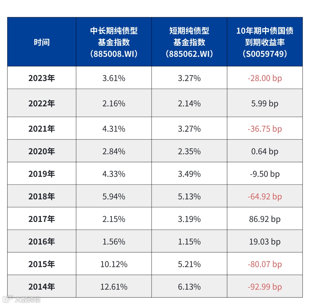 总体来看,根据Wind,我们可以发现,近10年(2014-2023年度),中长期、短期纯债型基金指数的年化波动率分别为1.02%、0.44%(周期:日;收益率算法:普通收益率)。
