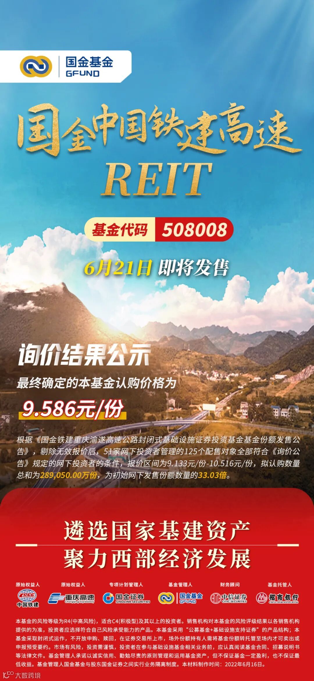 备受关注的西部首单公募REITs——国金铁建重庆渝遂高速公路REIT(基金代码:508008)又有新动向。6月17日国金基金发布公告,旗下国金铁建高速公路REIT将于2022年6月21日至22日正式发售,基金份额发售价格为9.586元/份,发售总份额为5亿份,募集总规模为47.93亿元(不含认购费用和认购资金在募集期产生的利息)。