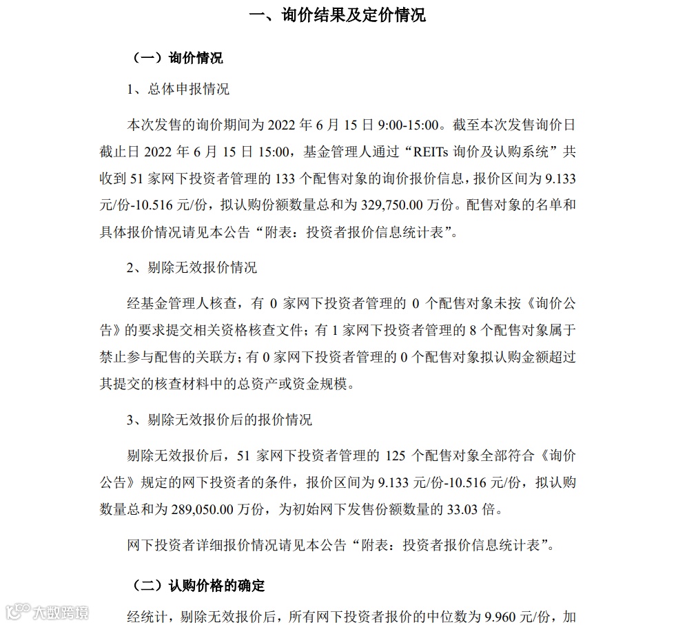 公告显示,国金铁建高速公路REIT于6月15日进行了网下询价,剔除无效报价后,共收到51家网下投资者管理的125个配售对象的询价报价信息,拟认购数量总和为289,050.00万份,为初始网下发售份额数量的33.03倍。