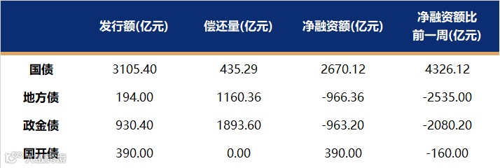 国债、国开、政金债、地方债发行量、偿还量、净融资额(与前一周比较)。