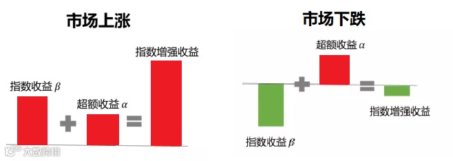 量化指数增强产品的收益可以拆分为追求跟踪对标的指数收益即系统性收益(β) 和在其基础上追求的超额收益 (α) 。简单来说,指数上涨时,量化指增产品争取比指数涨得多;指数下跌时,指增产品争取比指数跌得少。