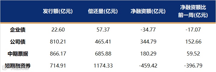 非金融企业短融、中票、企业债、公司债发行量、偿还量、净融资额(与前一周比较)