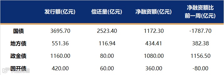 国债、国开、政金债、地方债发行量、偿还量、净融资额(与前一周比较)。
