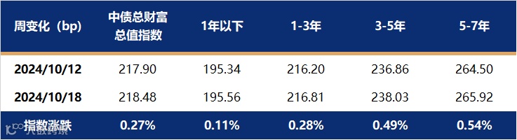 上周利率债市场延续修复行情,除国债1年、30年期限收益率小幅上行外,多数期限收益率下行。影响债市震荡走强的主要原因包括最新公布的9月基本面数据仍然偏弱,国新办新闻发布会关于地产增量政策略低于市场预期。截止至10月18日,1年期国债收益率报在1.4329%,较10月12日上行1.50bp;10年国债收益率报在2.1209,较10月12日下行2.32bp。中债总财富指数小幅上涨0.14%,其中7-10年、5-7年指数涨幅稍大,1-3年指数微涨。