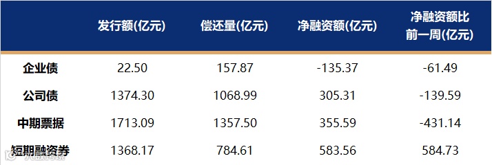 非金融企业短融、中票、企业债、公司债发行量、偿还量、净融资额(与前一周比较)