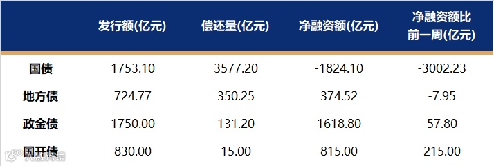 国债、国开、政金债、地方债发行量、偿还量、净融资额(与前一周比较)。