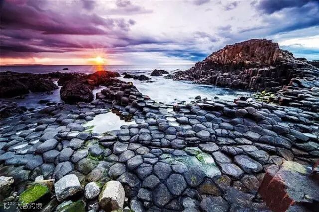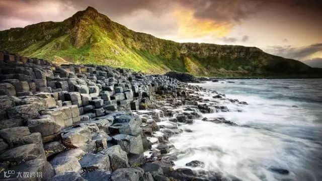 “巨人之路” 位于北爱尔兰安特令平原边沿,沿着海岸坐落在玄武岩悬崖的山脚下,由大约40 000个黑色玄武岩巨型石柱组成,这些石柱一直延伸到大海。这个令人称奇的景观使人们联想出巨人跨过海峡到达苏格兰的传说。300年来,地质学家们研究其构造,了解到它是在第三纪(大约5000-6000万年前)时由活火山不断喷发而成的。这个状观景点同时大大推动了地球科学的发展。