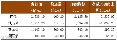一级市场:国债、国开、政金债、地方债发行量、偿还量、净融资额(与上周比较)。